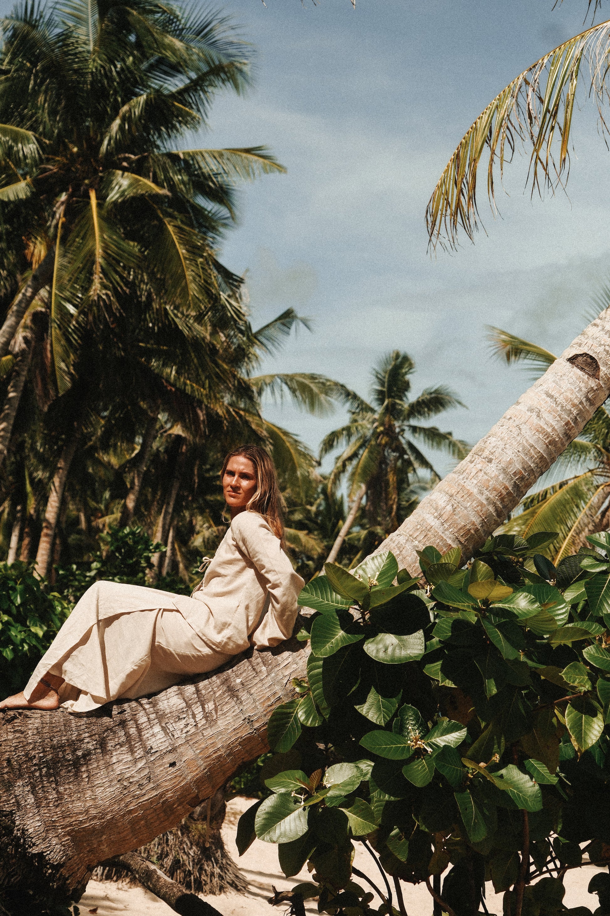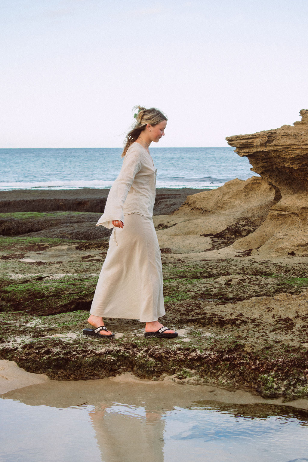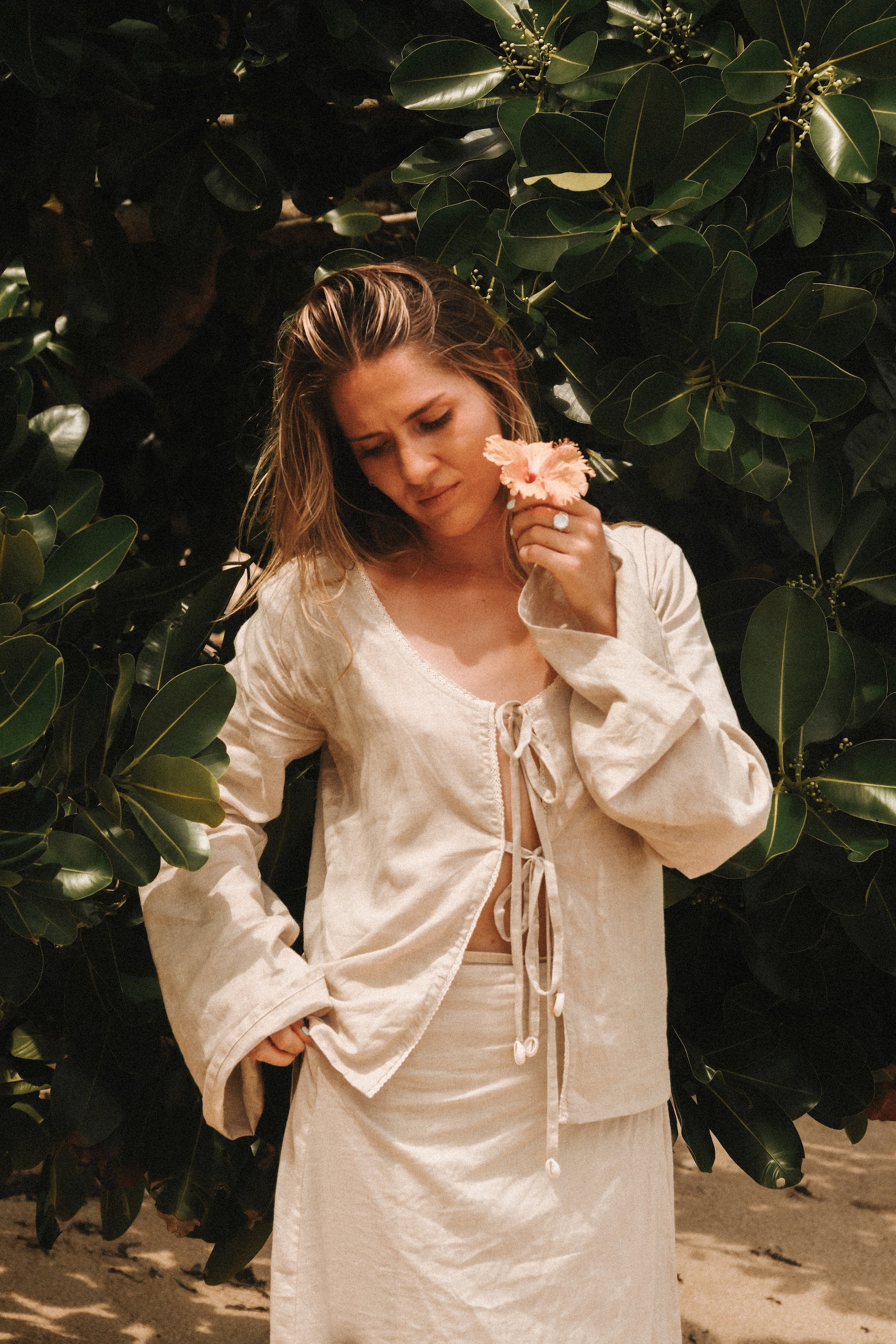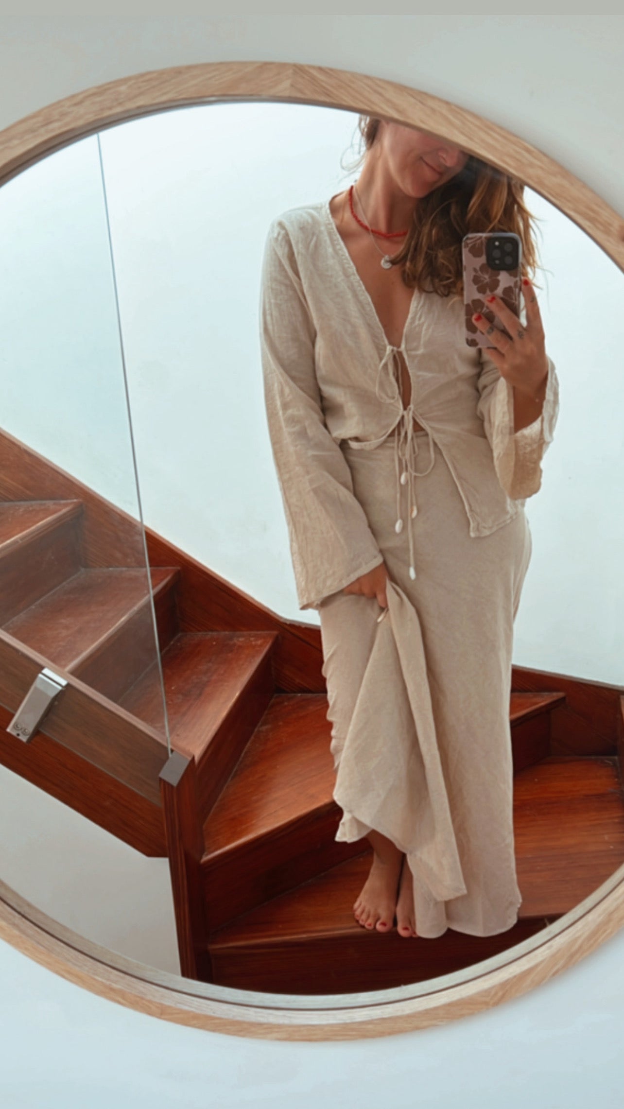 55% Linen % 45% Cotton, lightweight and breathable. Made ethically in Bali. Relaxed, flowy silhouette. Adjustable ties on front of top.